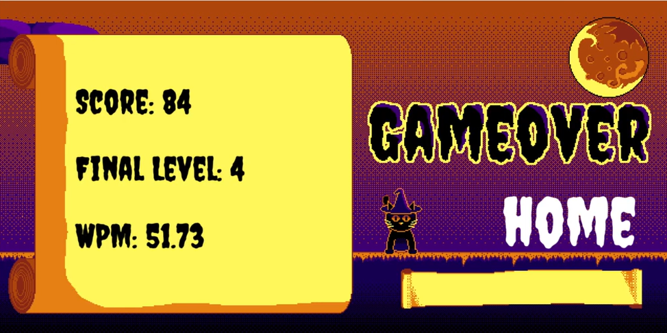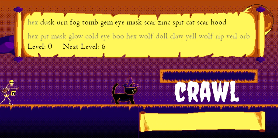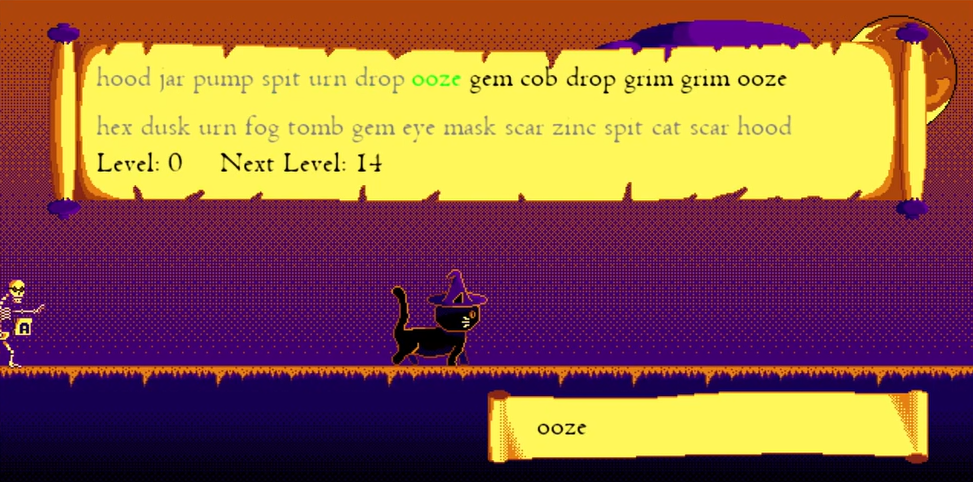 Help a black cat run from the spelleton, a spelling skeleton if you will! Dodge obstacles by typing them as they show up, all while keeping up with spelleton's spooky words!